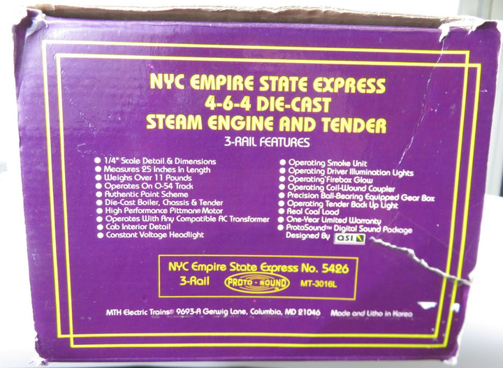 MTH MT-3016L O Gauge NYC 4-6-4 Empire State Express Hudson Locomotive Proto Sound