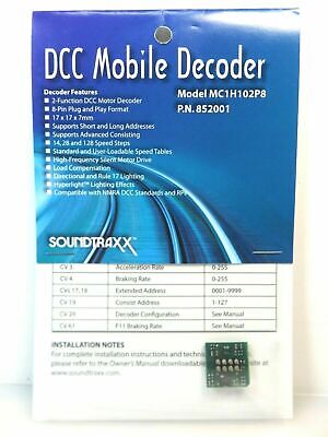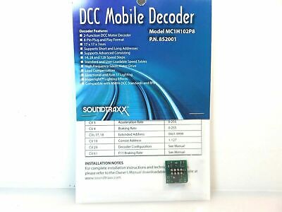 The SoundTraxx 852001 MCH1H102P8 is an HO-scale, 2-function decoder in a plug-and-play format ideal for use in a variety of train models. It is made with an NMRA compatible 8-pin 'direct-plug' and will operate in DCC only.