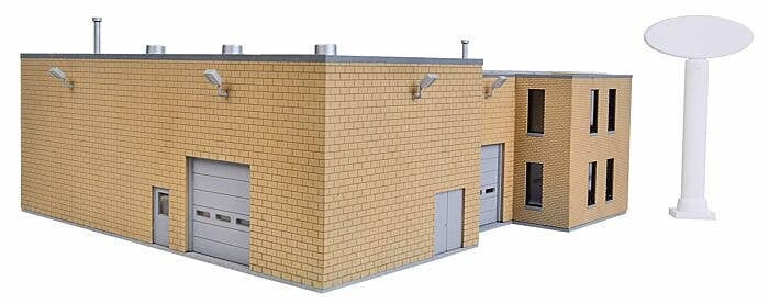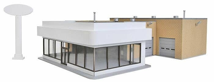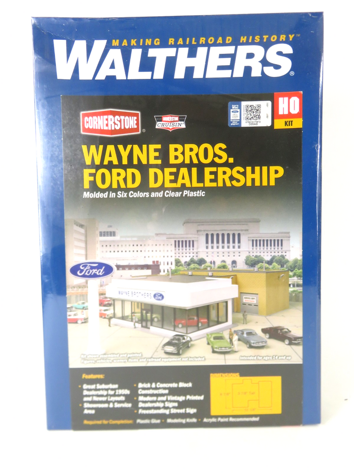 The Walthers Cornerstone Wayne Bros. Ford Dealership is a typical 1950s and later dealership complete with large showroom windows and a service bay area. With it's freestanding sign, clean showroom lines and businesslike brick-and-block construction in the service area it'll look great on Main Street or in a suburban auto mall. On your layout simply add appropriate vehicles, interior details in the showroom and figures (all sold separately) to create a realistic dealership. Wayne Bros. Ford Dealership measures 8-7/8 x 12-1/8 x 3-7/8" 22.5 x 30 x 9.8cm as shown.